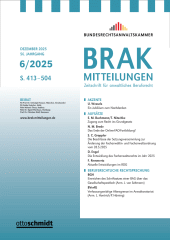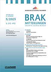 Die BRAK-Mitteilungen geben als Fachzeitschrift der Bundesrechtsanwaltskammer einen Überblick über aktuelle berufspolitische und berufsrechtliche Entwicklungen. Sie enthalten zudem amtliche Bekanntmachungen, insbesondere von Änderungen der Berufsordnung für Rechtsanwälte (BORA) und der Fachanwaltsordnung (FAO). Als Beilage berichtet das BRAK-Magazin aus der Arbeit der Bundesrechtsanwaltskammer und informiert über praxisbezogene Themen sowie interessante Veranstaltungen für Anwältinnen und Anwälte.